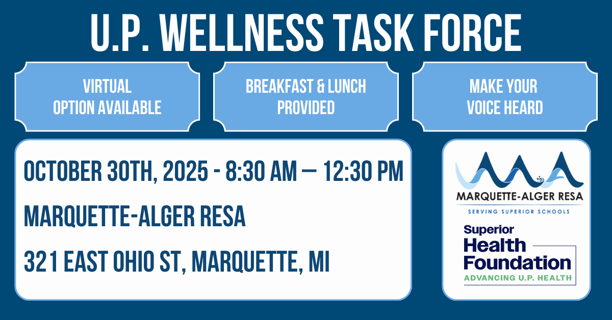 All are welcome to join us at Marquette-Alger RESA (321 E. Ohio St. Marquette, MI) to make your voice heard in the conversation as we work to support wellness for people of all ages across the U.P.