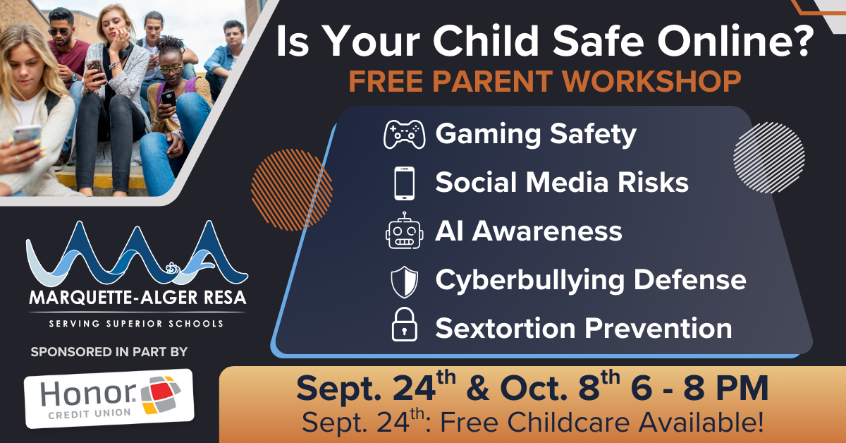 Join us at Marquette-Alger RESA (321 E. Ohio St. Marquette, MI) for an informative workshop designed to help parents navigate the challenges of raising children in today’s digital world. Learn strategies to keep your kids safe online, encourage healthy technology habits, and better understand the risks and opportunities of our connected age.
